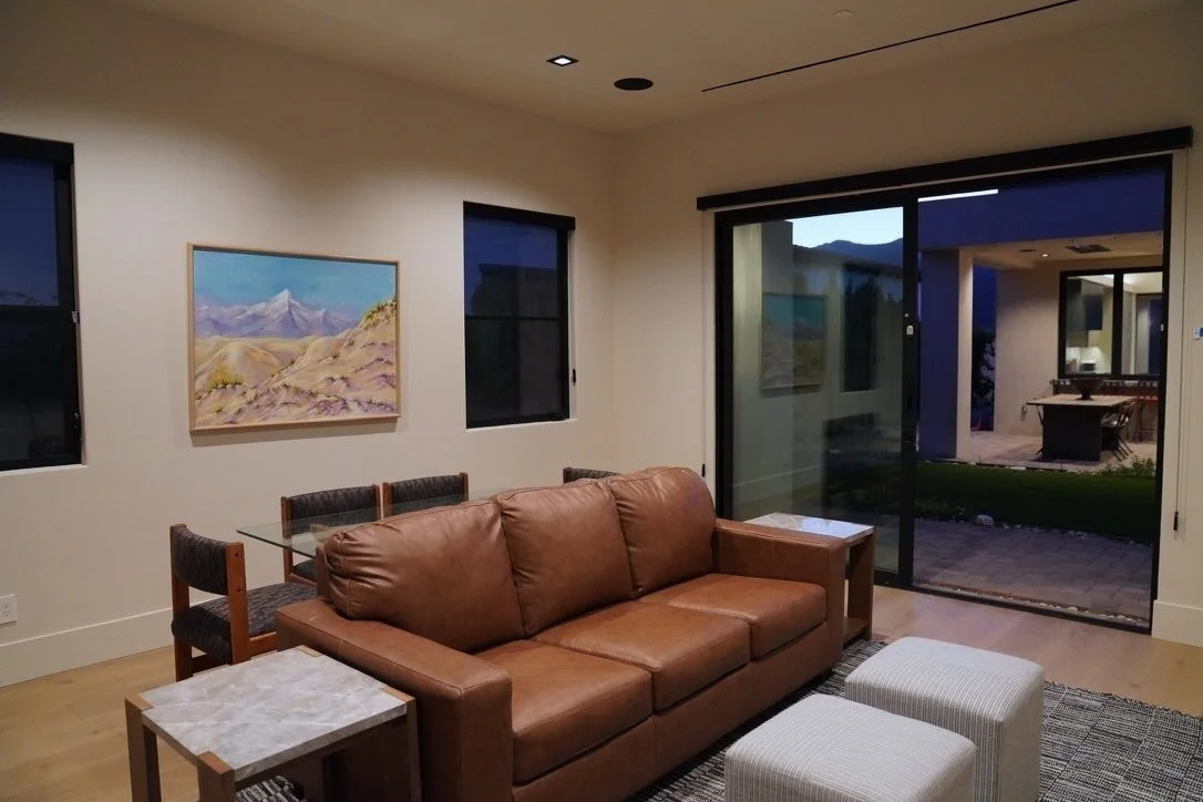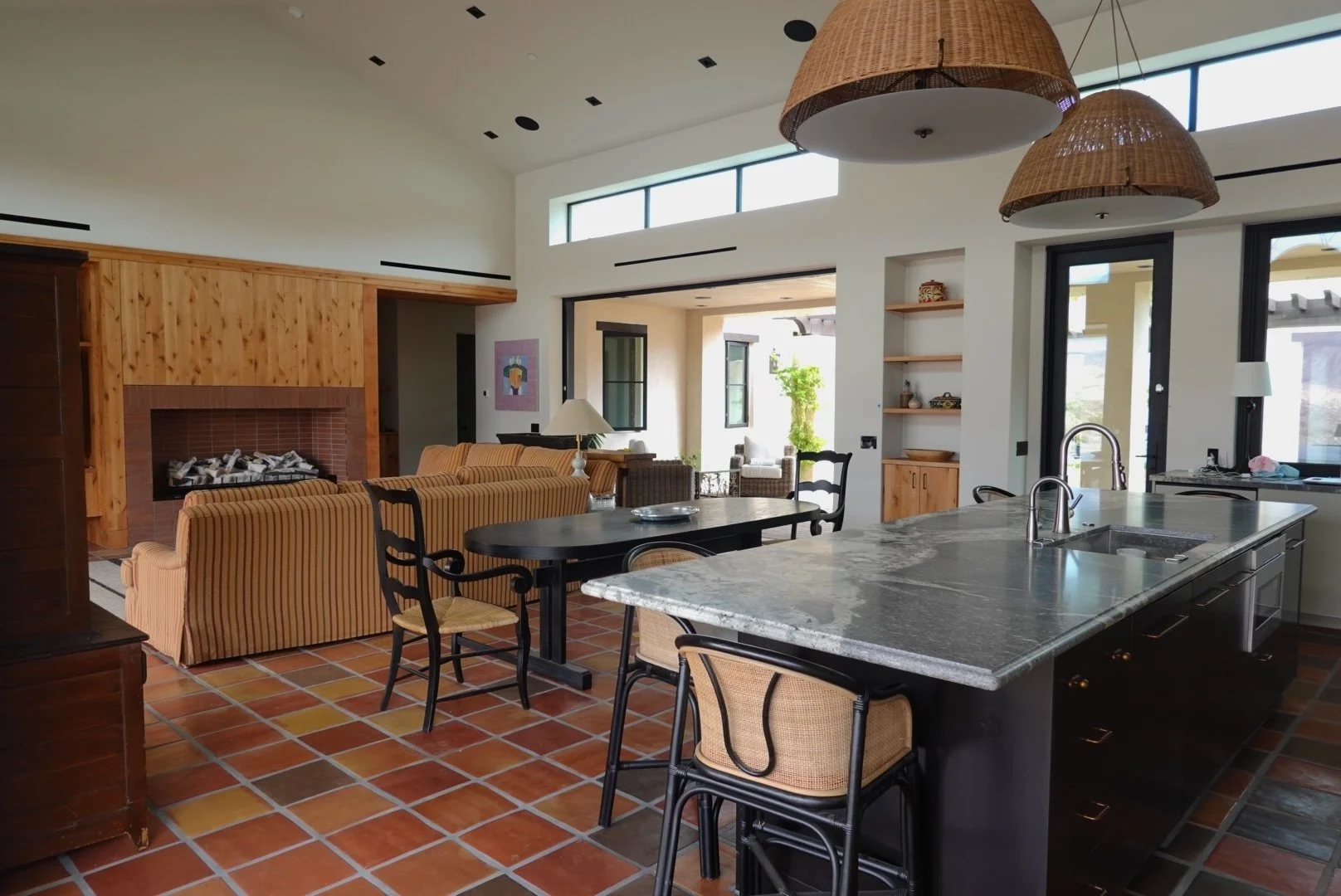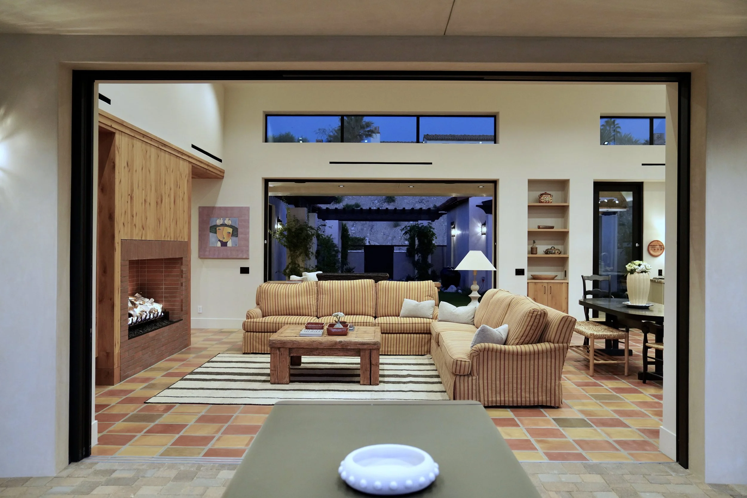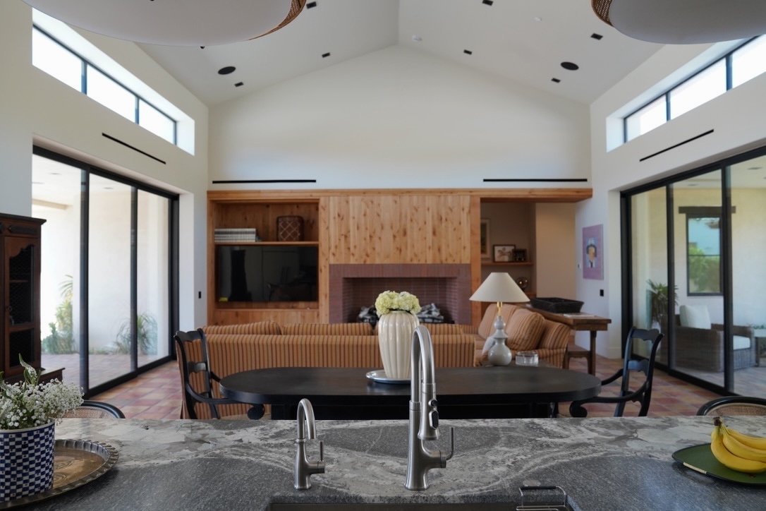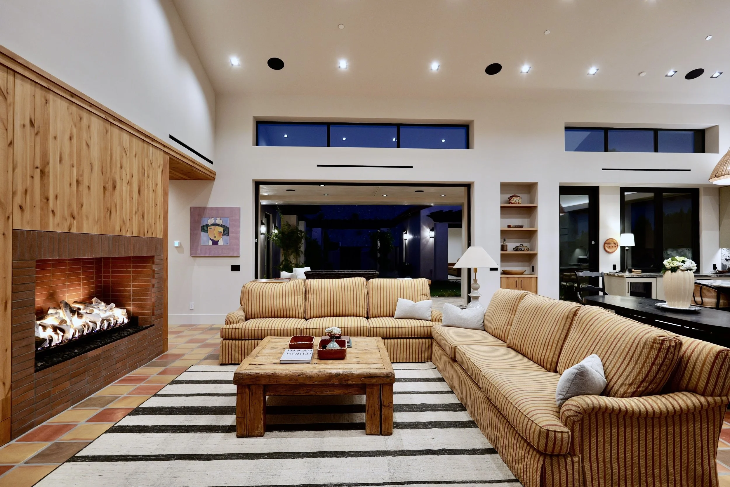 Transitional mid-century with clean lines, grounding details + natural materials.